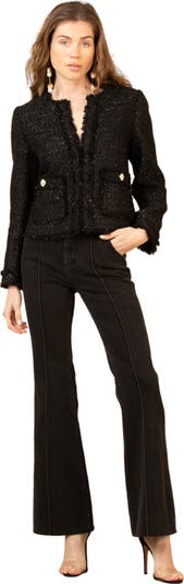Boucle wool blend tweed with fringe Fully lined (100% polyester) Button closure at front body Front pockets with flap Long slim sleeve Low hip length Boucle wool blend tweed with fringe Fully lined (100% polyester) Button closure at front body Front pockets with flap Long slim sleeve Low hip length