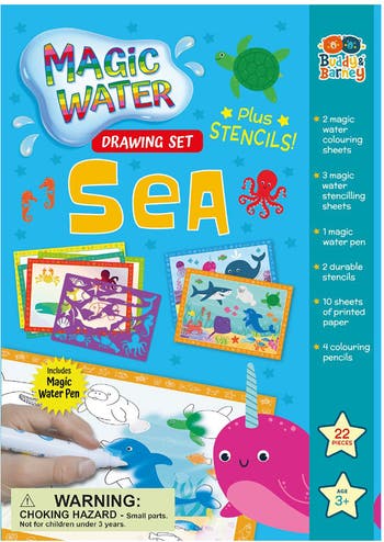 MAGIC WATER DRAWING SET: SEA - Dive into creative fun with the Buddy Barney Magic Water Drawing Set – Sea Edition! This exciting art kit allows children to explore the wonders of the ocean while expressing their creativity. Simply fill the included magic water pen and draw on the special reusable pages to reveal vibrant, underwater-themed images. When the water dries, the artwork disappears—ready to be recreated again and again for endless, mess-free fun. This set also includes two durable stencil sheets and coloring pencils to expand creative options even further. From tracing fish, dolphins, and turtles to designing unique undersea scenes, this kit encourages imaginative play, fine motor skill development, and creative thinking. Made with safe, non-toxic materials, the Magic Water Drawing Set is designed for children and ensures a stress-free art experience for parents. Lightweight and reusable, it’s perfect for home activities, travel, road trips, and quiet-time entertainment. Whether as a birthday present, holiday gift, or educational surprise, this ocean-themed drawing set is an excellent choice for young explorers who love art and sea life. INCLUDES: 2 Magic Coloring Sheets, 3 Water Stencils, 1 Water Pen, 2 Stencils, 10 Sheets of Paper, and 4 Coloring Pencils.