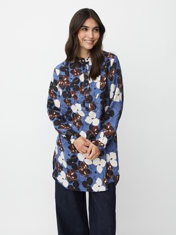 The finest hand-painted flowers adorn this tunic. It boasts a classic cut with straight lines, long sleeves and a round neck with a button placket, making it incredibly easy to style.