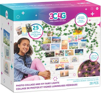 3C4G: PHOTO COLLAGE IVY FAIRY LGHTS - Decorate and customize any bedroom! Apply 25 photo collage cards and 3 trendy faux ivy plant string light to the wall to give the space a warm glow. Tweens can organize the collage however the heart desires and add their own photos to give it a personalized look! String lights continue to stay on trend for all ages, making this the perfect gift for stylish tweens no matter the occasion. Enjoy precious memories and positive vibes with this excellent addition to bedroom decor. Easy to use and reuse for endless fun and re-organizing. Perfect for tweens to express themselves at home! Three Cheers For Girls - Make It Real.