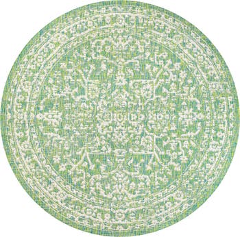 This colorful medallion rug adds rich Bohemian style to an outdoor porch or patio. Varied tones of soft green mingled with a cream pattern give this rug a hand-woven, vintage vibe. The flatweave design is great for high-traffic spaces indoors too.