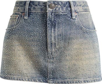 This faded denim miniskirt is made of nonstretch denim and covered in embellishment details that look like still-wet droplets.