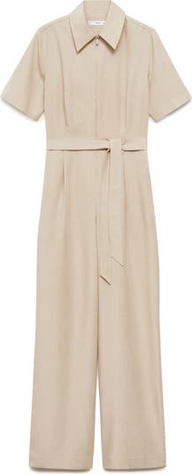 A matching tie belt cinches the waist of this on-trend utility jumpsuit fashioned with an edgy front-zip closure and made from a lightweight linen-kissed fabric.