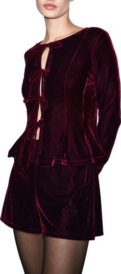 Four dainty bows secure this elegant velvet top that s perfect for your next event.
