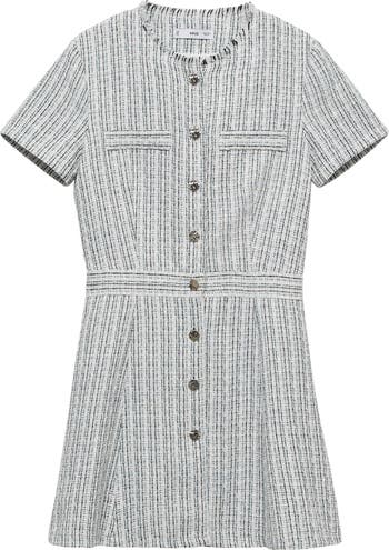 Hammered high-shine buttons adorn this stem-showing dress crafted from tactile tweed with a feathery fringed neckline.