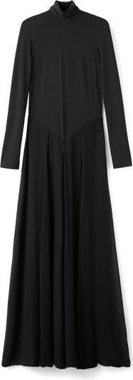 Go everywhere in this sophisticated turtleneck maxi made with a V-shaped drop waist and finished with a flowy skirt for graceful movement.