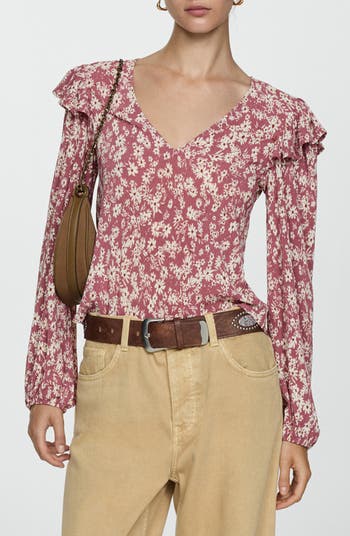 Voluminous ruffles frolick on the shoulders of this finely textured crepe top that s a versatile dream from office occasions to city outings.