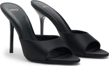 A curved strap and steep stiletto heel shape the minimalist silhouette of this shiny satin sandal.