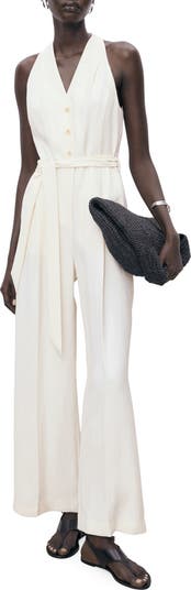 Ready to take on the day, this lightweight jumpsuit is framed by a deep V-neck and centered with a tie belt that shapes the silhouette.