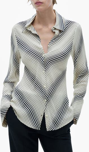 Lean into a 70s look with a diagonal-striped button-up shirt that s framed by long sleeves with elongated and flared one-button cuffs.