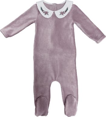 An embroidered Peter Pan collar lends floral flourish to this fancy footie made just for baby from supersoft ribbed velour.