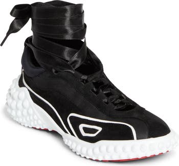 Ghillie-style satin ribbons wrap the ankle in this statement sneaker that deftly combines track-and-field elements with motifs from the captivating worlds of the circus and dance. A logo-scrawled red sole adds a signature Louboutin flourish.