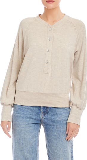 Pearlescent buttons shimmer at the front of a raglan-sleeve top in an ultrasoft and stretchy knit.