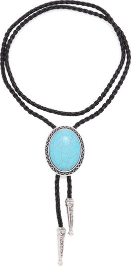 A faux-turquoise cabochon brings Southwestern charm to this wrapped lariat necklace anchored by a woven faux-leather cord suspending textured spike drops.