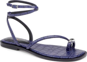 A hardware-accented toe ring and wraparound ankle strap offer stylish and secure wear on a leather sandal featuring memory foam cushioning for optimal underfoot comfort.