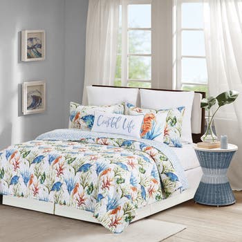 - Features an all-over print of coastal sea animals and seaweed. A coordinating blue and green organic trellis pattern on the reverse gives you an additional layering option. Crafted from 100% cotton, we ve sourced high quality materials to ensure this products longevity. Lightweight and Breathable for Use in Any Season Twin Set: 1 Quilt 1 Standard Sham Queen Set: 1 Quilt 2 Standard Shams King Set: 1 Quilt 2 King Shams