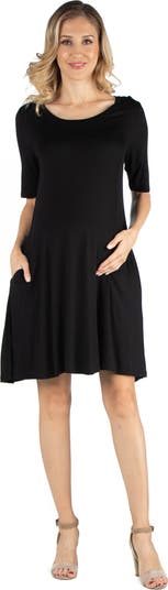 A perfect mix of style and practicality, this a line maternity dress features elbow length sleeves, scoop neckline and pockets. Easy to layer with and style, the loose fit and soft flare hemline offers a flattering fit for all silhouettes. Made from a comfortable stretch material. Rayon Spandex Knit.