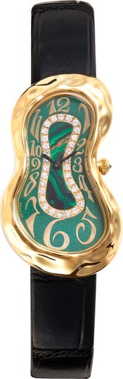 The Möbius watch, named for the famed three-dimensional demonstration of four-dimensional space, replicates the concept through the look of flowing molten metal through a distorted, compressed loop framing the malachite-patterned dial inset outlined in lab-grown-diamonds. An inverted lab-grown green diamond crowns the crown.