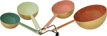 This set of Enameled Measuring Cups with Leather Tie and Gold Finish is a stylish addition to any kitchen. Featuring four vibrant colors, a gold finish, and a leather tie, this set perfectly complements farmhouse, cottagecore, Boho, or novelty styles. The set includes 1 cup, 1/2 cup, 1/3 cup, and 1/4 cup sizes, ideal for precise measuring in baking and cooking. Made of durable stainless steel with an enameled finish and leather tie, these measuring cups ensure long-lasting beauty and functionality. The vibrant colors and gold finish add a touch of elegance to any kitchen decor. The leather tie not only provides a stylish element but also keeps the measuring cups neatly organized when not in use.