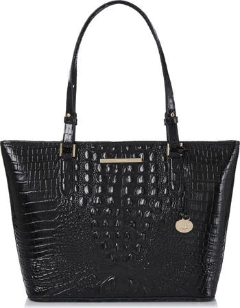 Glazed croc-embossed leather accented with gleaming logo-etched hardware enhances the smart look of this structured tote. Handles that adjust for a perfect fit and signature Brahmin touches—including an array of pockets, a light-colored lining and a convenient key clip—add to the bag s versatility.
