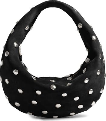Crafted from velvety Italian suede dotted in silvery studs, this 90s-nostalgic hobo bag has a pillowy, softly curved shape that contours comfortably to your shoulder.