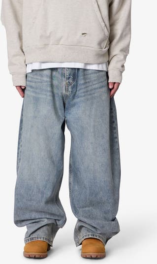 Fashioned from nonstretch denim with a waxed and whiskered finish, these ultrawide-leg jeans instantly up your street-style game.