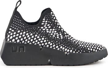 The Mega Fab is a slip-on sneaker, combining technical elements with a brutalist, block-shaped EVA rubber outsole, embossed with the iconic United Nude Logo. It features a stretchy graphic woven sock upper and a breathable mesh insole.