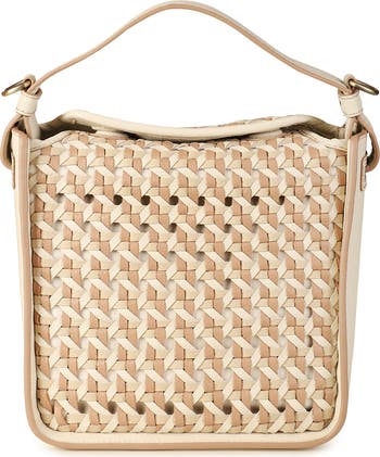 Top handle tote with handwoven off white / barley leather over natural canvas. Fully lined with inside pocket and removable shoulder strap.