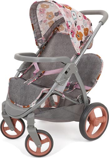 509 CREW: MELANGE FLORA - MABELLE DUO TWIN DOLL STROLLER - The 509 Crew Mabelle Duo Twin Doll Stroller in Melange Flora is the ultimate choice for little ones who adore their twins or favorite dolls. Designed with realism in mind, this twin stroller features all the details of a genuine baby stroller, including a handy shopping basket, a retractable canopy, and smooth two-toned front swivel wheels. The stroller’s Melange Flora fabric, a durable polyester, is easy to maintain with simple hand washing, while the parent handle is padded with comfortable foam. REALISTIC ROLE-PLAY: Perfect for imaginative play, this doll accessory allows little parents to care for their favorite dolls and plush characters in a realistic and engaging way. SAFETY LOCK SYSTEM: Safety is paramount with the stroller’s lock system, which requires both side latches to be lifted for folding, ensuring stability during playtime. Perfect for role-playing and imaginative fun, the twin stroller accommodates dolls up to 18" (46 cm) and offers a delightful mix of fantasy and real-life parenting experience. ***Doll not included.***