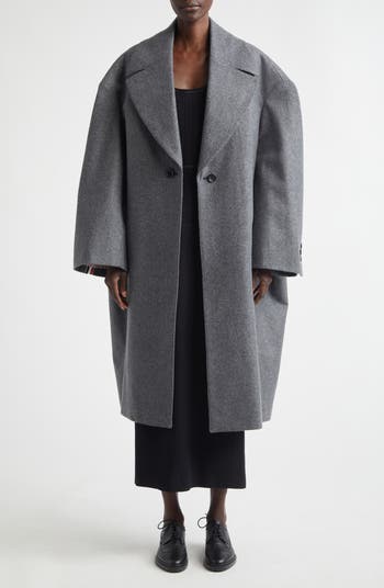 Melton wool provides the warmth as well as the sculptural structure to this generously oversized coat tailored simply and symmetrically in a raglan-sleeved cocoon silhouette.