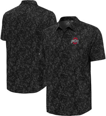Get in vacation mode while sporting your Ohio State Buckeyes in style with this Button-Up Shirt from Antigua. The relaxed fit and self-collar with top sleeve stitching make it a comfortable and stylish option for any casual occasion. The embroidered team patch heat-sealed to the left chest adds a touch of team spirit, while the palm tree print throughout provides a laid-back, island-ready look.