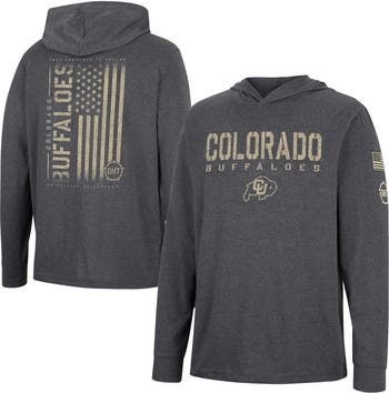 Represent the Colorado Buffaloes in patriotic fashion with this Colosseum OHT hoodie T-shirt. Not only does it feature distressed team graphics across the front and back, but the embroidered American flag and Operation Hat Trick logo on the left sleeve allow you to give a big thank you to our military members. Showing your appreciation for those brave individuals and the Colorado Buffaloes has never been easier than it is with this long sleeve tee.