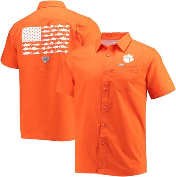 The Men s Columbia PFG Orange Clemson Tigers Slack Tide Camp Button-Up Shirt is the perfect way to show your support for the Clemson Tigers. Made from durable polyester, this shirt features a droptail hem with side splits for added comfort and style. The glasses cleaning patch at the bottom of the buttons is a convenient touch, and the left chest pocket with utility loop provides ample storage space. The screen print graphics proudly display the Clemson Tigers logo, and the UPF 50+ protection keeps you safe from the sun s harmful rays. The ventilated back panel ensures you stay cool and comfortable, even on the hottest game days.