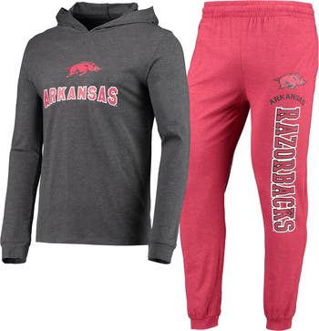 When cooler temperatures hit, kick back while you stay warm in this Arkansas Razorbacks Meter Hoodie T-shirt and jogger pants set. It features the official Arkansas Razorbacks logo printed above the team name on both pieces. An elastic waistband also provides a flexible fit for added comfort.