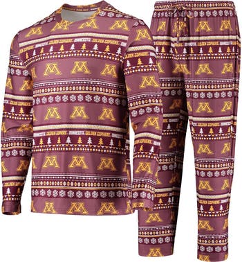 Make the holiday season full of Minnesota Golden Gophers cheer with this festive Ugly Sweater T-shirt and pants sleep set from Concepts Sport. Its playful pattern features a whimsical combination of winter-themed designs and Minnesota Golden Gophers graphics. An adjustable waistband also provides a personalized fit for the most comfortable feel.
