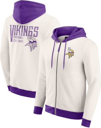 Showcase your timeless Minnesota Vikings pride with this Distressed Graphics Full-Zip Hoodie from the Darius Rucker Collection by Fanatics. Crafted from a soft cotton blend, this hoodie offers warmth and comfort throughout the day. The team logo embroidered on the left chest and distressed screen print graphics on the back pay homage to the Minnesota Vikings storied history.