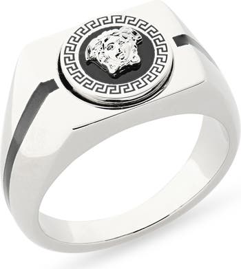 Versace s iconic Medusa head holds court on this signet ring crafted in Italy with enameled Greek-key detailing and a liquid-shine finish.
