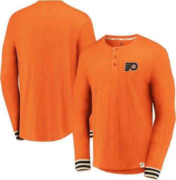 Represent your Philadelphia Flyers pride with the Fanatics Branded Heathered Orange Philadelphia Flyers True Classics Henley Long Sleeve T-Shirt. This stylish and comfortable shirt features a three-button placket, rib-knit cuffs, and a rounded droptail hem, ensuring a perfect fit and a touch of casual elegance. Made from a soft cotton and polyester blend, this long sleeve tee is perfect for game day or any day you want to show your support for the Philadelphia Flyers.