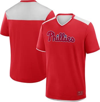 Show off your Philadelphia Phillies pride in this Walk Off V-Neck T-Shirt by Fanatics. The stretch jersey fabric and mesh panel provide a lightweight, breathable feel that is perfect for warm weather. A twill team logo appliqu elevates the design, while the rounded droptail hem and rib-knit V-neck add stylish touches to this Philadelphia Phillies shirt.