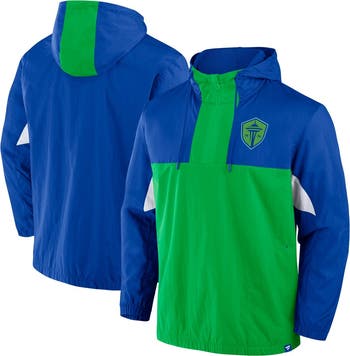 Take on inclement weather in this Seattle Sounders FC Free Kick Woven Quarter-Zip Hoodie Jacket by Fanatics. Its mesh-lined adjustable hood provides customizable coverage from the elements and adds breathability. The crinkle fabric in club colors gives this Seattle Sounders FC jacket a classic look.
