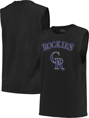 The Majestic Threads Black Colorado Rockies Softhand Muscle Tank Top is the perfect way to show your support for the Rockies. Made from soft cotton, this tank top features distressed screen print graphics that give it a vintage look. The rib-knit collar and arm holes provide a comfortable fit, making it perfect for game day or any day.
