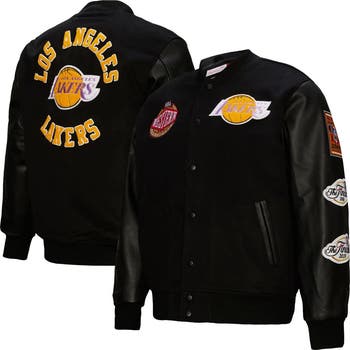 Channel the classic style of the Los Angeles Lakers with this Mitchell Ness Hardwood Classics Blackout Collection Full-Snap Varsity Jacket. This heavyweight jacket, crafted from a blend of wool and polyester, boasts faux leather sleeves and trim for a touch of classic varsity style. With chenille patches on the front and back, embroidered team patches on both sleeves and the team name proudly displayed along the right pocket, this jacket showcases your Los Angeles Lakers pride in every detail.