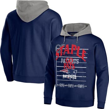 The Men s NFL x Staple Navy New England Patriots Throwback Vintage Wash Pullover Hoodie is a must-have for any devoted New England Patriots fan. Crafted from a cotton and polyester blend, this midweight hoodie is perfect for moderate temperatures. Screen printed graphics proudly display your unwavering support for the New England Patriots, making it the ideal way to represent your team on game day or any day.