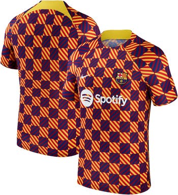 Look just like your favorite Barcelona players when stepping onto the pitch by sporting this 2023/24 Pre-Match top from Nike. Embroidered on the front is an applique of the club s iconic logo, which sits on top of an eye-catching sublimated design. Whether you re getting ready to score the game-winning goal or cheer on your favorite Barcelona players, the raglan sleeves will help provide effortless movement.