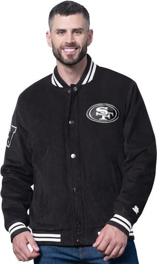 You re a devoted San Francisco 49ers fan so look your best on cooler game nights with this Blackout Varsity Jacket from Starter. The soft corduroy fabric provides a unique texture and comfortable feel, ideal for moderate temperatures. Tonal, embroidered twill applique graphics adorn the front, back, and sleeves, boldly displaying your team allegiance. Rib-knit cuffs, a stand-up collar, and a hem with white stripes add to the jacket s iconic design, while two side pockets offer practicality and a place to warm your hands. This classic-fit jacket offers a comfortable silhouette, making it the perfect statement piece for any dedicated San Francisco 49ers fan.