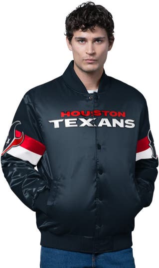 Rep your team in style with this Houston Texans Triple Option Satin Varsity Full-Snap Jacket from Starter. With its rib-knit standup collar, cuffs, and hem, this midweight jacket is perfectly suited for moderate temperatures. The embroidered fabric applique wordmark at the chest and team logos on both sleeves boldly declare your Houston Texans pride.