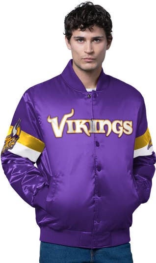 Rep your team in style with this Minnesota Vikings Triple Option Satin Varsity Full-Snap Jacket from Starter. With its rib-knit standup collar, cuffs, and hem, this midweight jacket is perfectly suited for moderate temperatures. The embroidered fabric applique wordmark at the chest and team logos on both sleeves boldly declare your Minnesota Vikings pride.