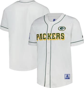 Channel classic baseball style while repping the Green Bay Packers with this Starter Relay Full-Button Baseball Jersey. Made from breathable 100% cotton, this baseball jersey provides a comfortable and classic fit for everyday wear. The embroidered fabric applique graphics add a touch of texture and dimension, showcasing your Green Bay Packers pride with a vintage athletic aesthetic.