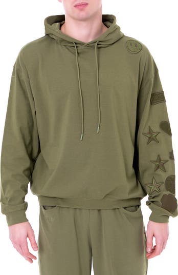 Dai Moda menswear army green drawstring hoodie with various patches on left sleeve.