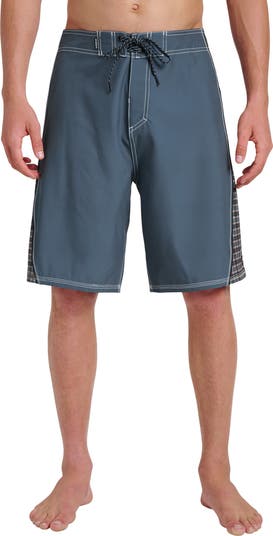 Plaid insets give a slightly retro vibe to these quick-drying board shorts featuring four-way stretch for optimal movement.